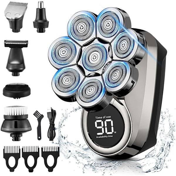 Hovedets barbermaskine til mænd, 8D 6 i 1 elektrisk barbermaskine, IPX7 vandtæt, hovedbarbermaskine til mænd med LED-skærm og rengøringsmiddel