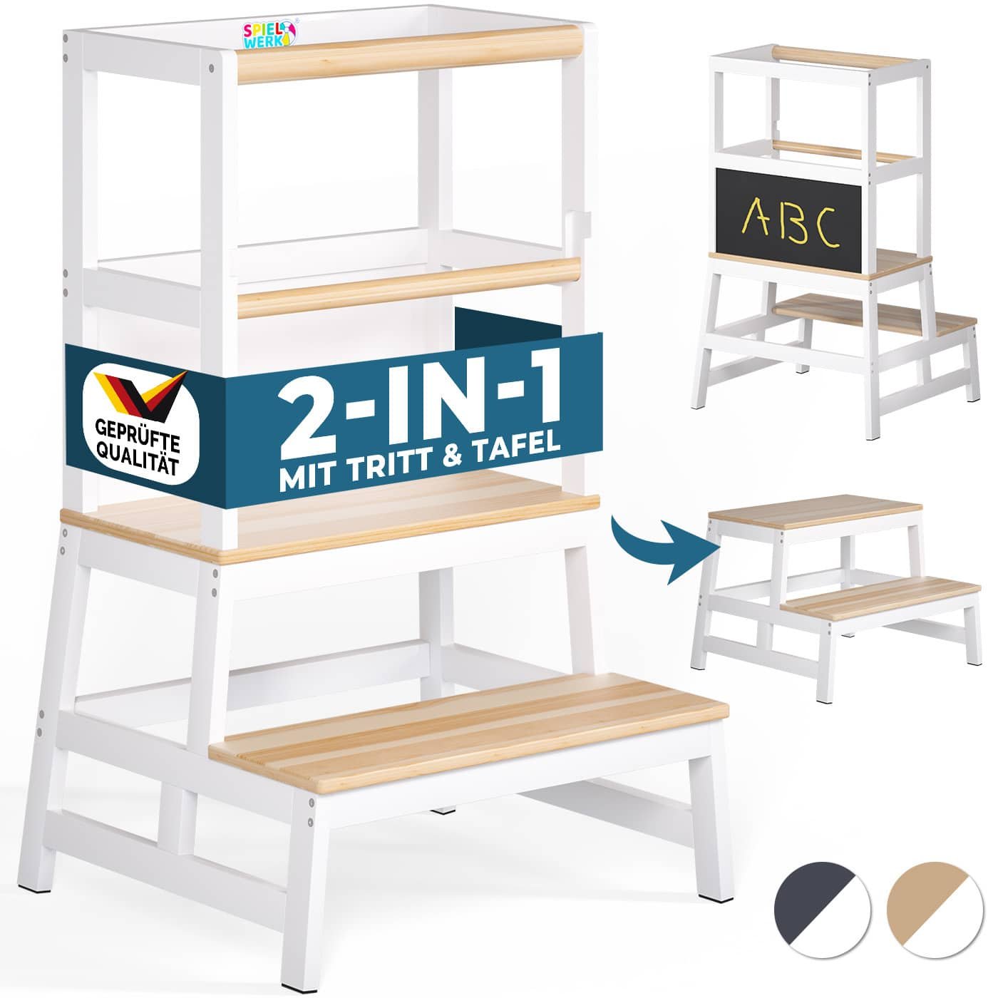 Produktfordele: Stabilt børnelæringstårn i trapezformet design for optimal stabilitet 2 beskyttelsesstænger – for endnu mere sikkerhed afrundede kanter håndværk af høj kvalitet, praktisk og holdbart perfekt højde til køkkenelementer ekstra bred ståflade S