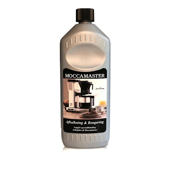 Moccamaster har fremstillet et særligt afkalknings- og rengøringsmiddel, som er helt lugtfrit. Dette produkt både afkalker og renser din brygger for fedt og kafferester, holder din kaffemaskine i topform og forlænger dens levetid. Ved regelmæssigt at afkalke din brygger vil den fortsætte med at levere fulde kander på bare 6 minutter i lang tid fremover. En flaske på 1 liter er nok til tre afkalkningscyklusser.